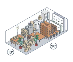 Our 10x20 storage units, offering 200 square feet of space, are ideal if you’re transitioning between homes, preparing your house for sale, or undertaking a major renovation. Comparable to a small garage, these units can easily hold the belongings of a three- or four-bedroom house.